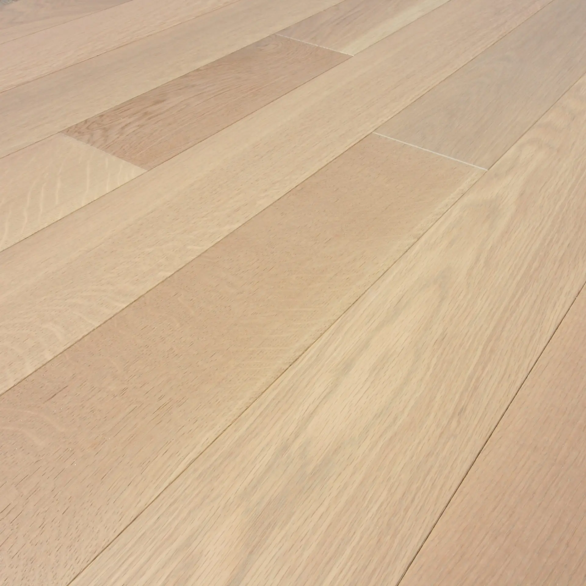 The Elegance Plyquet Rift & Quartered (R&Q) Collection offers White Oak in 8 different colors and a sophisticated selection of hardwood flooring characterized by its unique cutting techniques and premium construction. Featuring a 4mm top layer and a 3/4″ thickness, this collection ensures lasting durability and stability. The “rift” cut produces linear, vertical grain patterns by slicing logs at a slight angle to the growth rings, while the “quartered” cut involves cutting logs into quarters before slicing, creating a straight, vertical grain that enhances the wood’s stability and visual appeal. This meticulous process results in flooring with a refined, elegant look, showcasing the wood’s natural beauty with fewer knots and a consistent grain. The Rift & Quartered Collection combines aesthetic appeal with durability, making it an ideal choice for both residential and commercial spaces aiming for a timeless, high-end appearance.