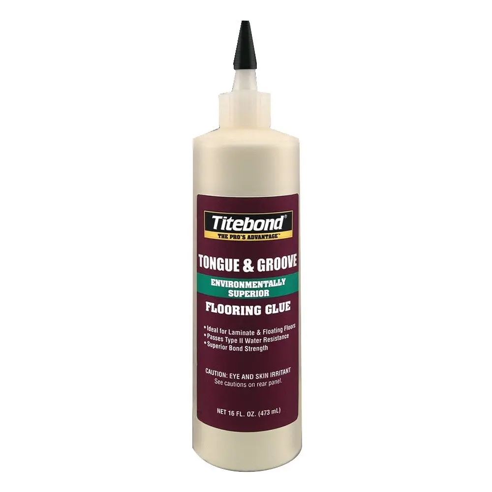This glue is designed especially for floating install of a tongue and groove engineered wood flooring. The elasticity in this glue is what separates it from regular wood glue and will prevent cracking from repeat pressure on the flooring seams. This glue passes the ANSI Type II water resistance test and offers superior bonding strength. It is non-toxic and nonflammable, making it safe to use and environmentally friendly. Titebond Tongue & Groove Flooring Glue also resists solvents and water when dry making it the most used edge glue for wood flooring contractors.